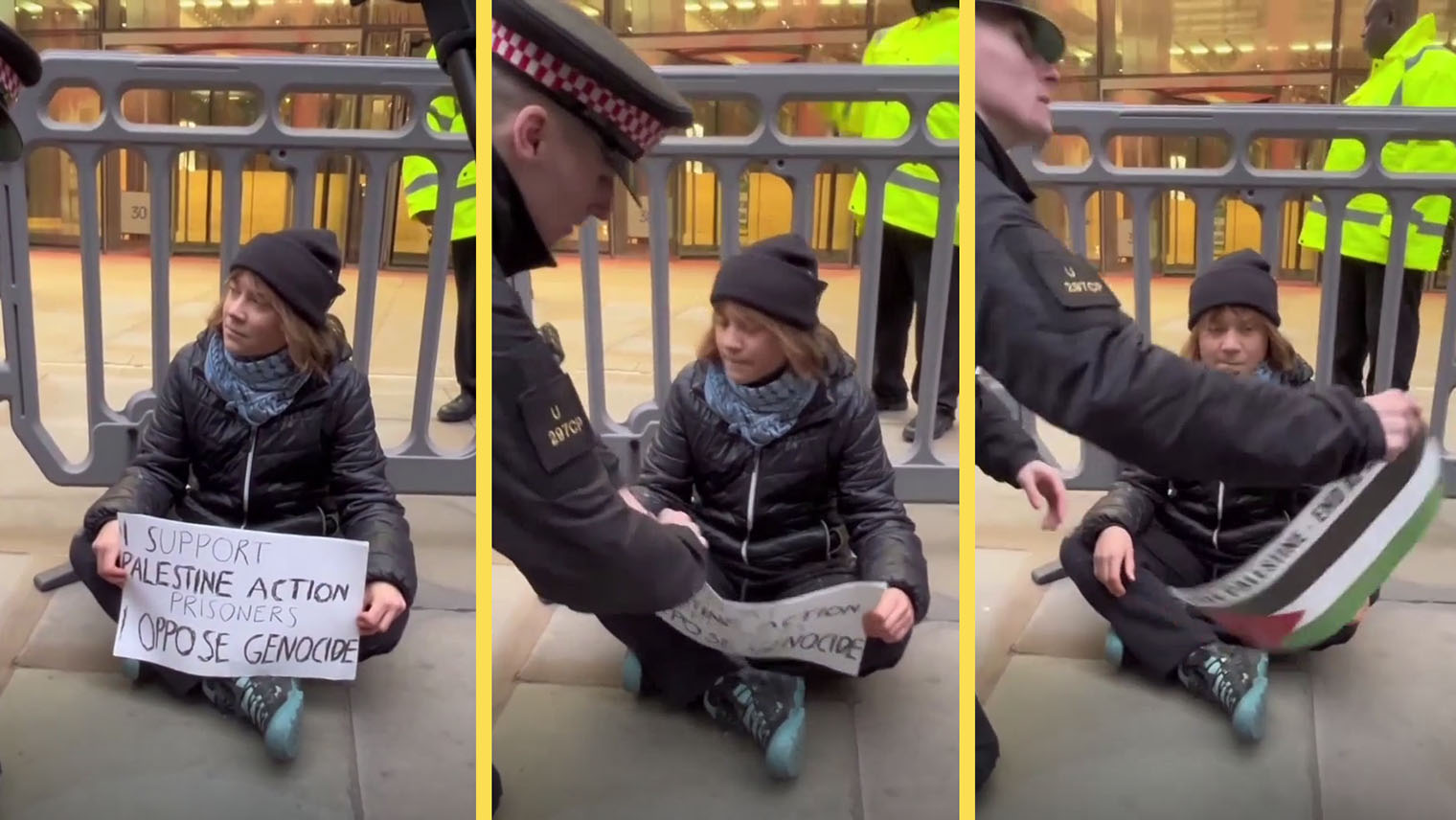 Enligt City of London Police greps Thunberg under Terrorism Act 2000 då hon bar en skylt med texten ”I support the Palestine Action prisoners. I oppose genocide.” Att visa stöd för en organisation som klassas som terrorist kan leda till straff, vilket understryker de allvarliga konsekvenserna av hennes handlingar.