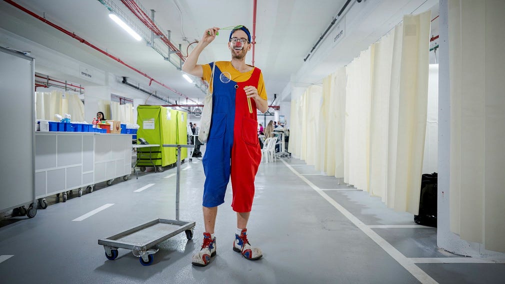 Trots den pressade situationen försöker Pulke hålla humöret uppe. ”Jag har inga ord varken på hebreiska eller engelska just nu. Men det är skönt att arbeta, då behöver jag inte tänka så mycket”, säger han. Pulke använder sina klownfärdigheter för att försöka göra miljön mindre skrämmande för barnen, även om han själv kämpar med trötthet.