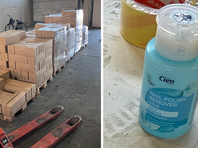 Två personer lämnade snabbt lokalen när miljöförvaltningens personal anlände. Där fann man också packytor, tomma kartonger, oanvända påsar för ompackning, tejp, förslutningsmaskin samt lösningsmedel som aceton och nagellacksborttagningsmedel. Ämnena användes för att sudda ut gamla etiketter och byta bäst före-datum, vilket nu bekräftar olaglig hantering.