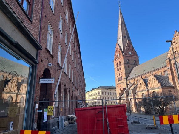 Bygget gäller ombyggnaden av församlingshuset på Själbodgatan vid Sankt Petri kyrka, där det planerade hyreshuset nu har stannat upp i väntan på utredning.