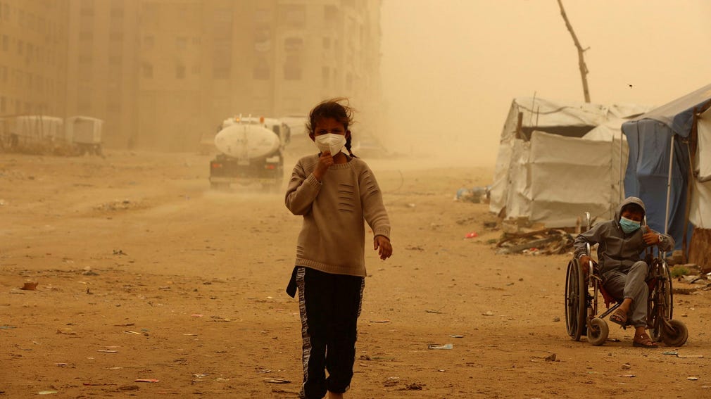 Inte heller Gazas slitna tält stod emot ovädret. Videoklipp visar hur ett tjockt lager orangefärgat damm lagts sig över landremsan, vilket gjort sikten minimal. Gator, byggnader och människor framträder endast som suddiga skuggor genom det täta dammet. Luften är fylld av partiklar, och himlen har försvunnit bakom ett ogenomträngligt dis. Även de som bor kvar i hus drabbades. Fotografen Hussein Abdul Jawad berättar om svidande ögon och svårigheter att vistas utomhus: ”Luften var kvävande, vi kunde knappt se eller röra oss ute. Hela mitt hem är täckt av damm.”